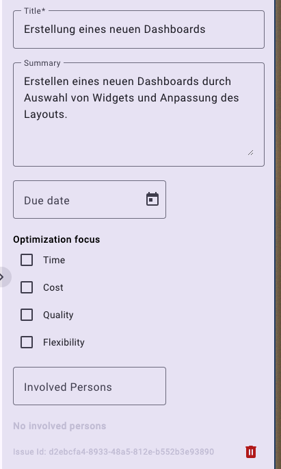 Das rechte Panel enthält alle konfigurierbaren Eigenschaften deines Issues. Ganz oben findest du den Titel und die von der KI erzeugte Zusammenfassung, die du bei Bedarf manuell anpassen kannst – für mehr Klarheit oder Genauigkeit. Darunter kannst du ein Fälligkeitsdatum festlegen, um ein klares Ziel für die Bearbeitung zu setzen. Anschließend wählst du eine der vier Prozessverbesserungs-Dimensionen – Zeit, Kosten, Qualität oder Flexibilität – um das Issue strategisch einzuordnen. Diese Auswahl orientiert sich am klassischen „Teufelsviereck“ aus dem Business Process Management, wurde aber benutzerfreundlich in die Oberfläche integriert. Außerdem kannst du per @Mention Kolleg:innen oder Stakeholder direkt einbeziehen, um sie in die Diskussion einzubinden. Ganz unten befindet sich ein kleines Papierkorb-Symbol, mit dem du das gesamte Issue löschen kannst – eine Bestätigungsabfrage schützt vor versehentlichem Entfernen.
