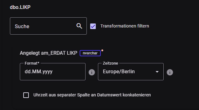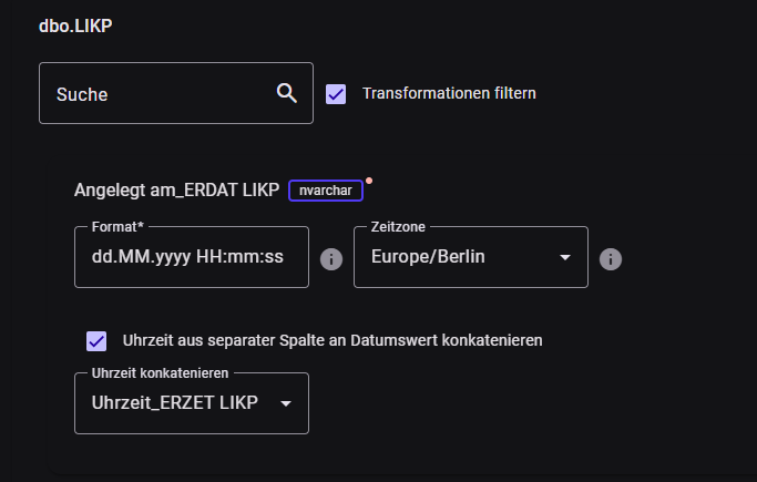 - Auf Zeitstempelebene: Soll zu der Datumsangabe nun noch eine Zeitangabe aus einer anderen Spalte hinzugefügt werden (häufig z.B in SAP-Systemen), so muss der Haken bei "Uhrzeit konkatenieren" gesetzt werden. Anschließend wird der Spaltenname mit der Uhrzeit ausgewählt und der Formatierungs-String mit Stunden, Minuten, Sekunden ergänzt.