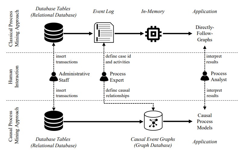 Klassische Ansätze (obere Spur in der Abbildung) bestehen aus vier Schritten. Zuerst werden während der Ausführung eines Geschäftsprozesses Transaktionen in eine Datenbank eingetragen. Diese Transaktionen werden in Tabellen relationaler Datenbanken gespeichert, die durch Fremdschlüsselbeziehungen mit unterschiedlichen Kardinalitäten miteinander verbunden sind. Zweitens definiert ein Prozessexperte für die Erstellung des Event Logs den notwendigen Case-Identifier, spezifiziert die Prozessaktivitäten sowie dazugehörige Eigenschaften wie Ressourcen, Zeitstempel oder andere Geschäftsobjekte. Auf Basis dieser Informationen wird ein flaches Event Log extrahiert. Drittens wird dieses Event Log in den Arbeitsspeicher geladen und ein DFG daraus berechnet. Viertens kann ein Prozessanalyst die Visualisierung am Bildschirm interpretieren.